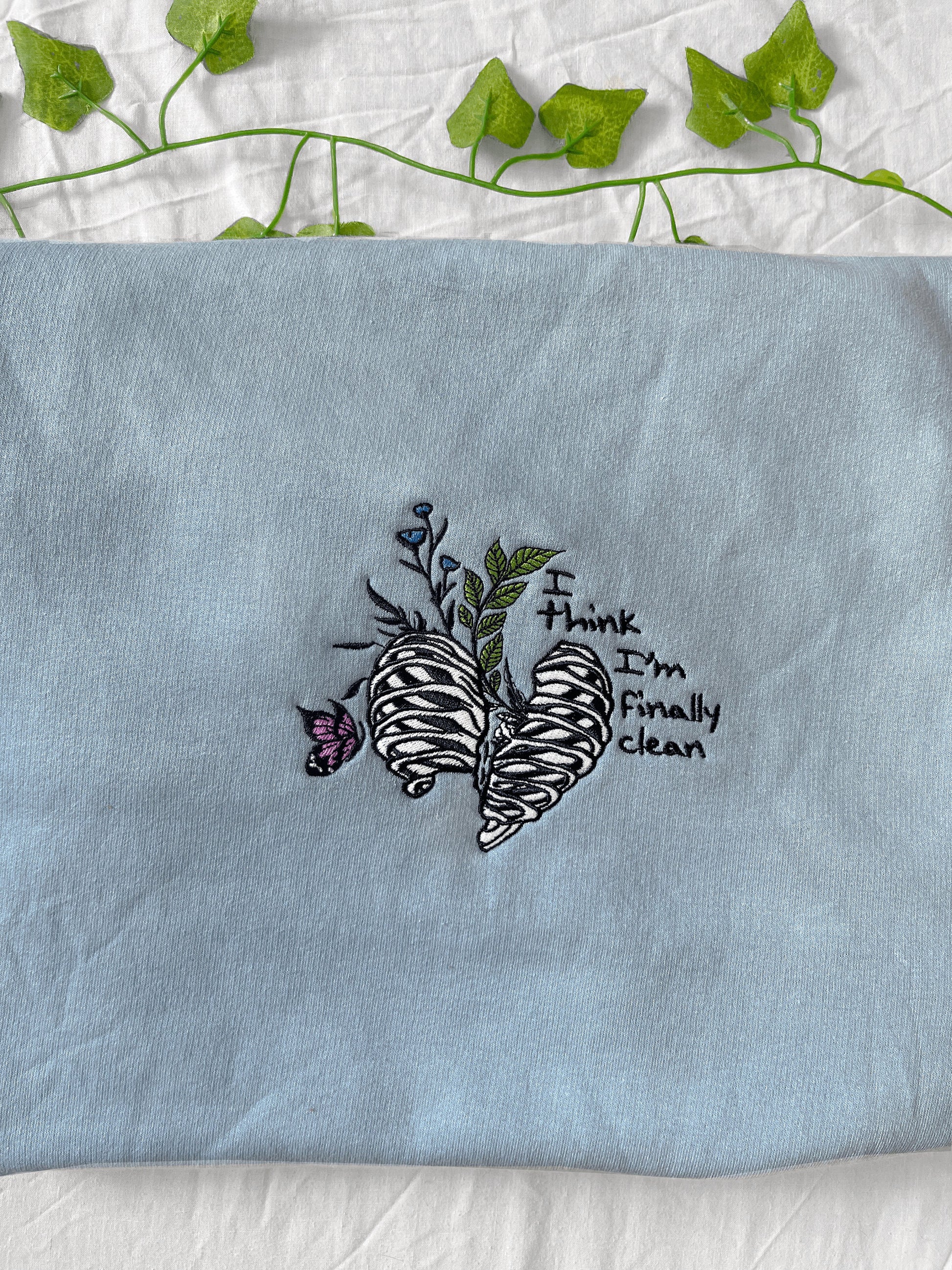 Each crewneck is 80% cotton and 20% polyester, long-sleeved and comes in the shade of sky blue. Unisex fit, each sweatshirt is true to size. The design is then embroidered on the crewneck using an embroidery machine and shipped from London, UK. The backing of the embroidery makes it more durable and ensures a smooth wearing experience.