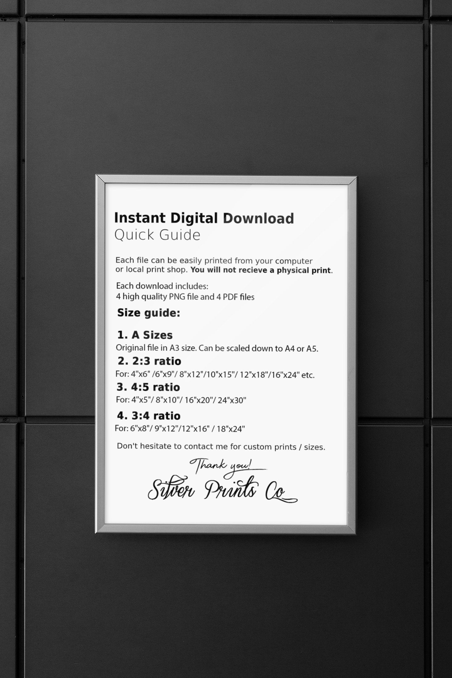 Your purchase includes 8 scaleable, print-ready (300 DPI) files: 4 PDFs & 4 PNGs, in the following resolutions: