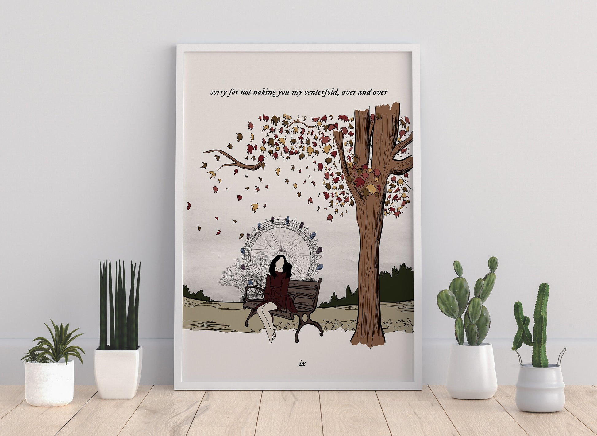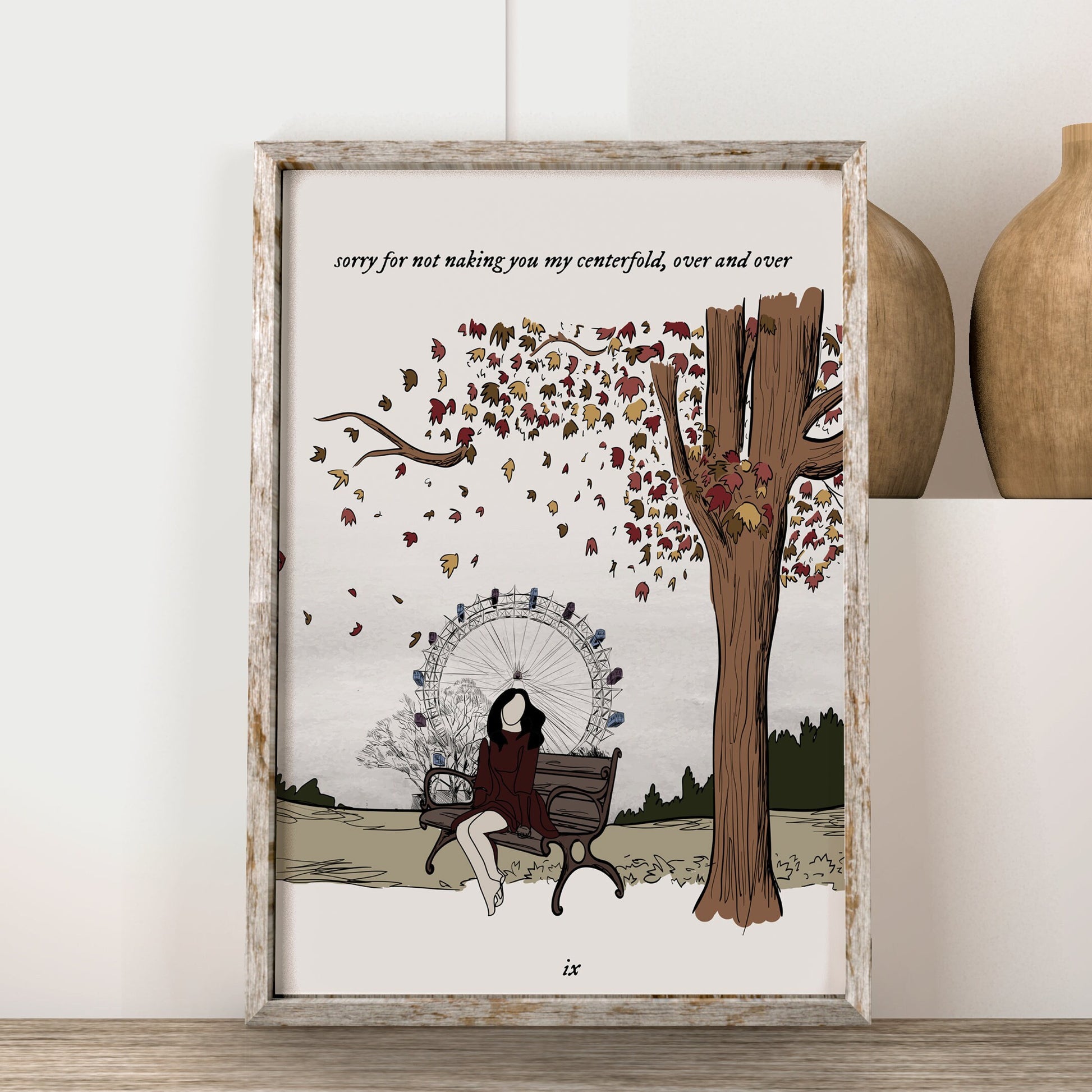 This print is inspired by Taylor Swift's recent studio album, 'evermore', featuring a lyric from 'cony island' - 'sorry for not making you my centerfold, over and over'. It features an illustration of a woman sitting on a bench in front of a ferris wheel, with autumn leaves falling down.