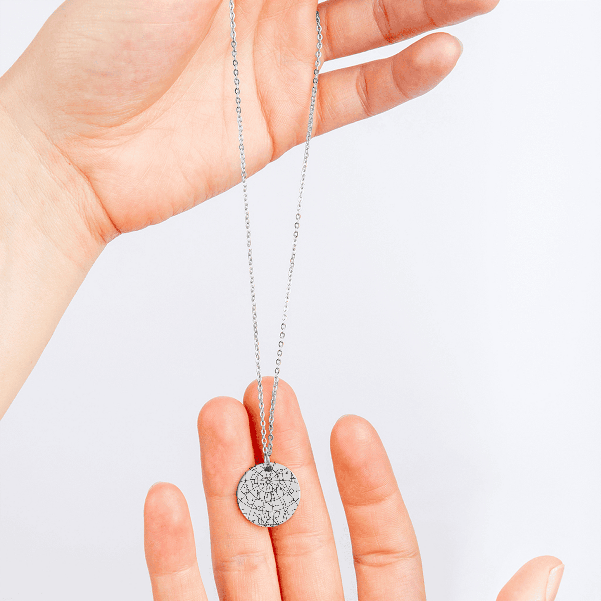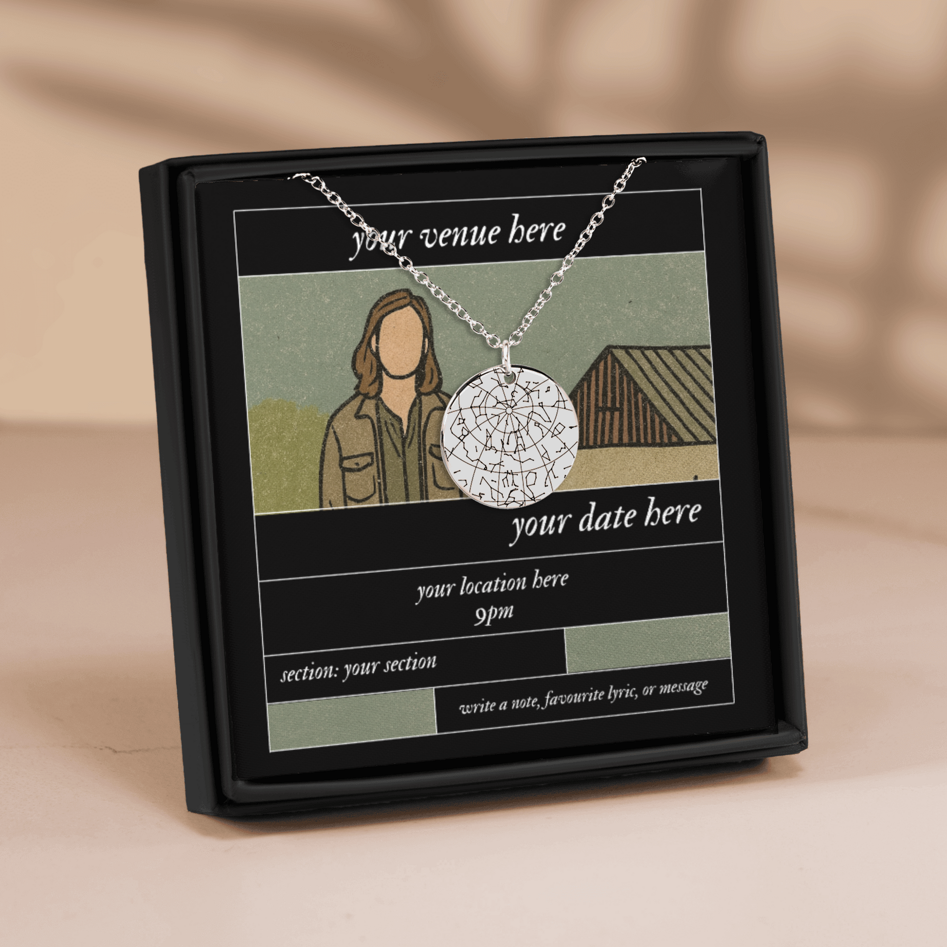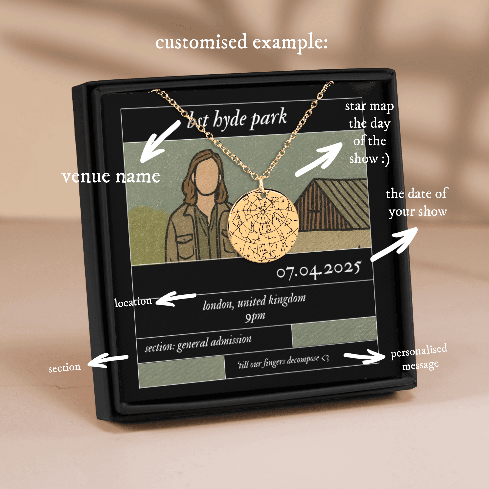 This custom tour necklace is a wearable souvenir designed for live music lovers who know the magic of a concert - especially one shared with friends or someone special. Capture the exact moment you stood beneath the stars at your favourite show with a personalised Night Sky Star Map engraved on the pendant’s front, and a delicate engraving on the back pinpointing the date and location.