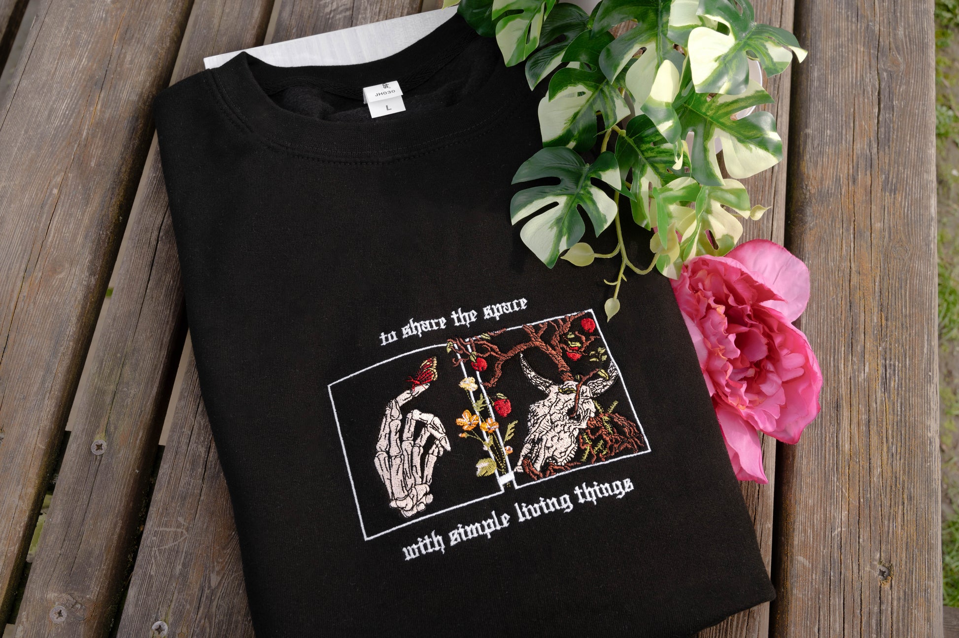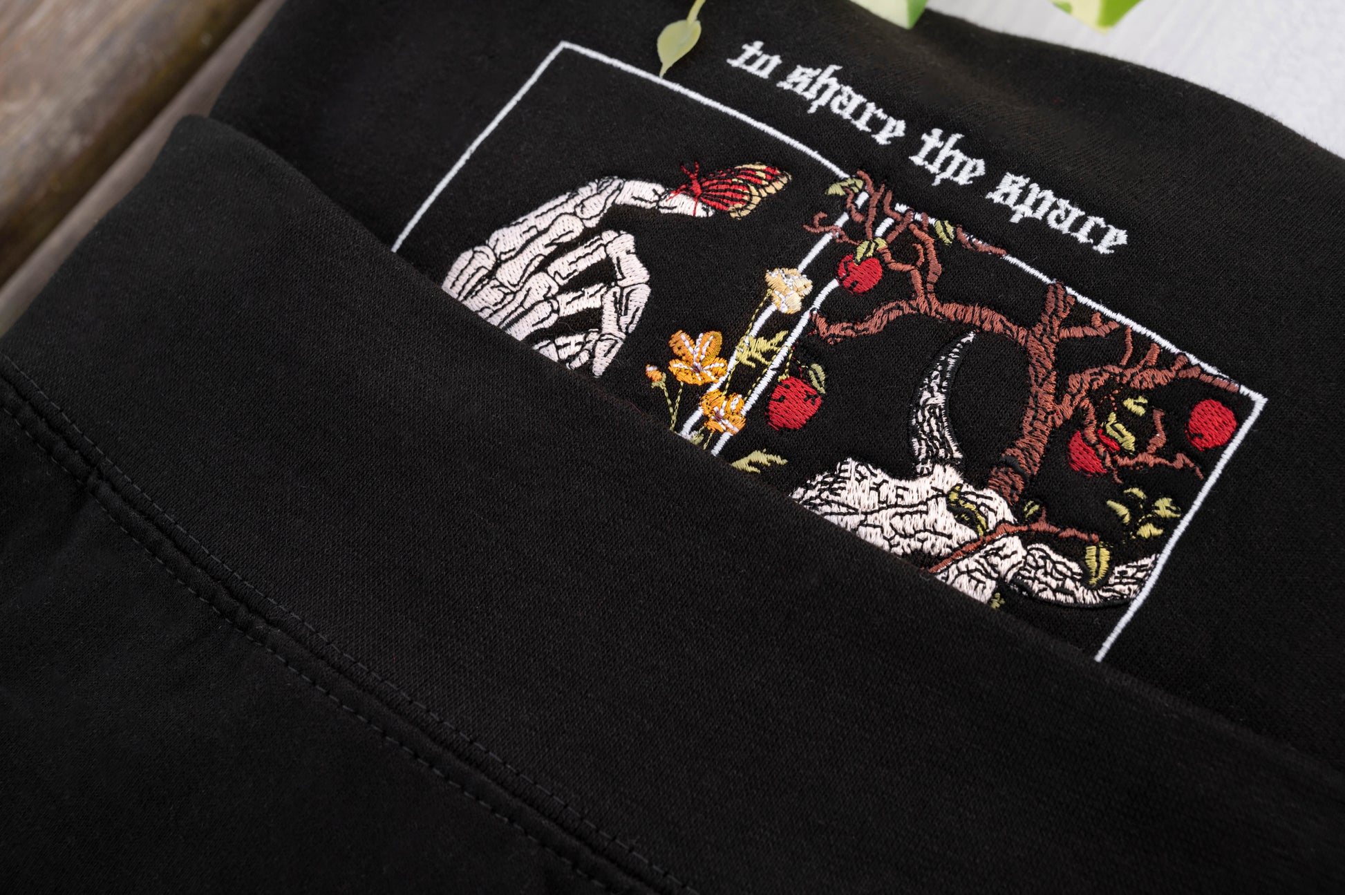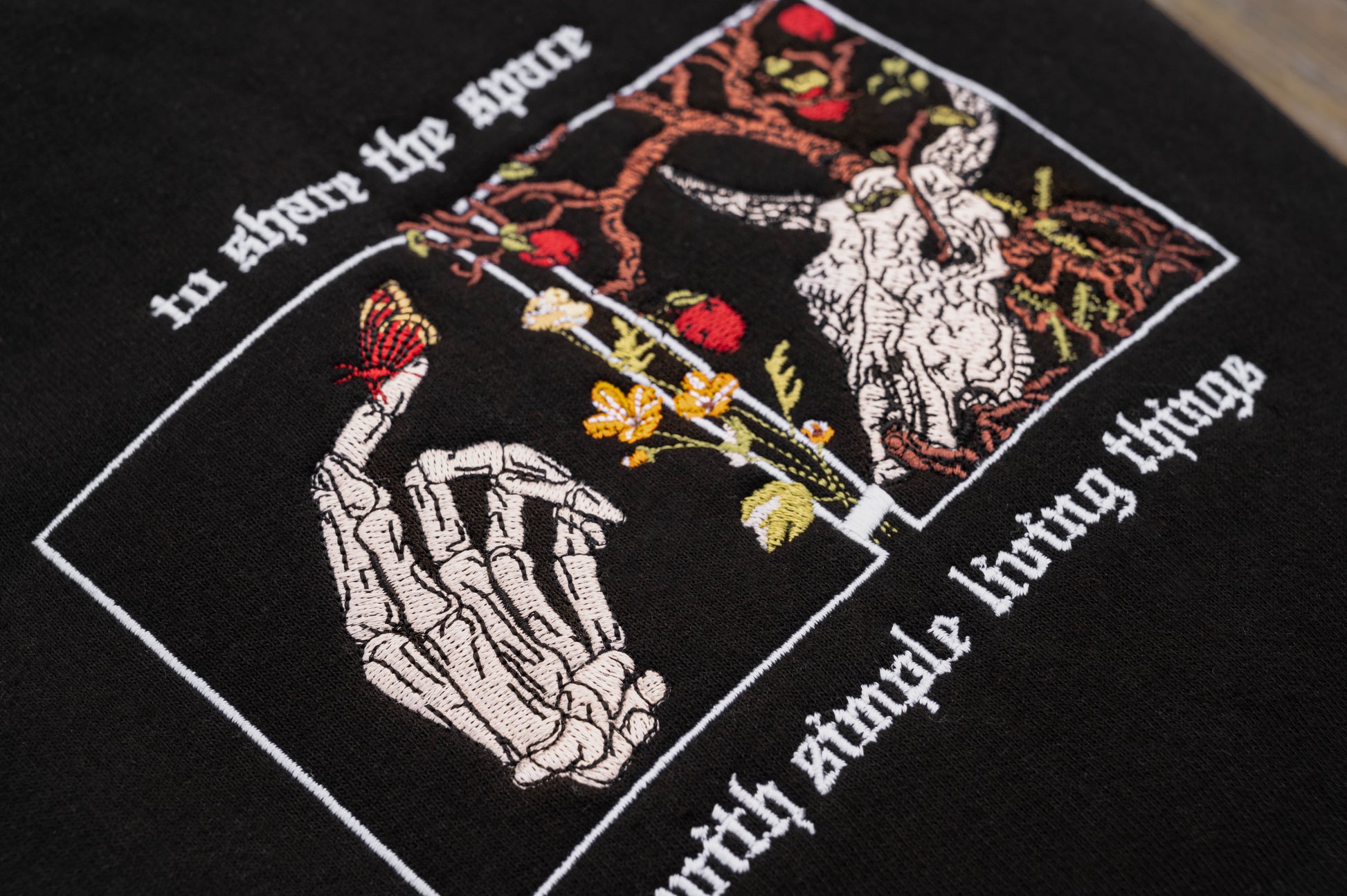 Very few things feel as Hozier-y as the combination of skeletons and blossoms - the very same cycle of life and death described on First Time, which represents limbo. Embroidered with the lyric 'to share the space with simple living things', this design captures both the beginning and the end, the growth and the decline, in true Hozier fashion.