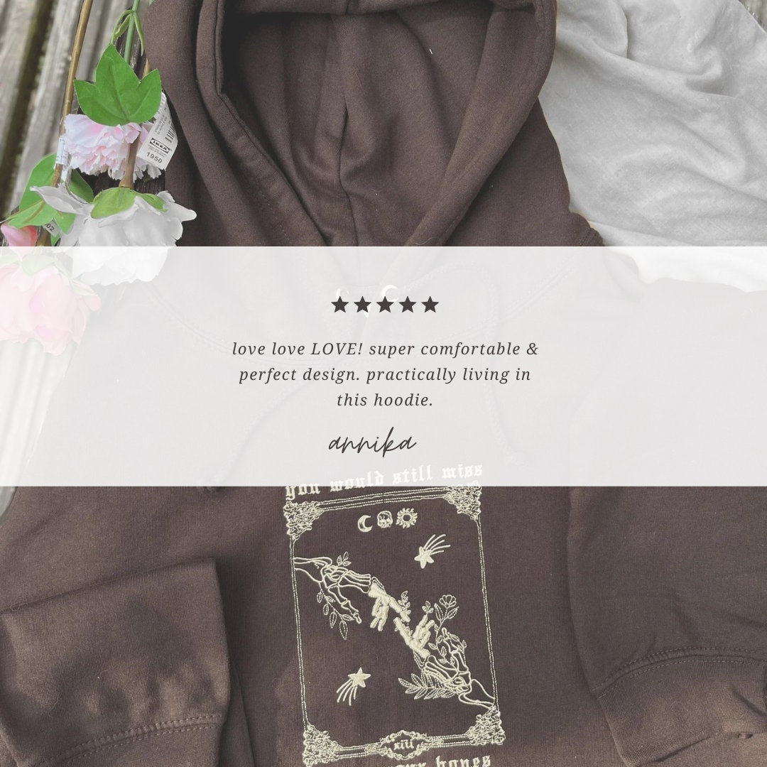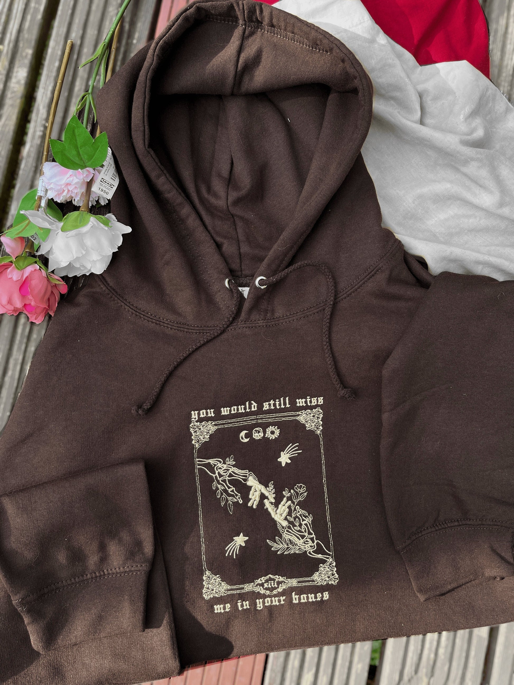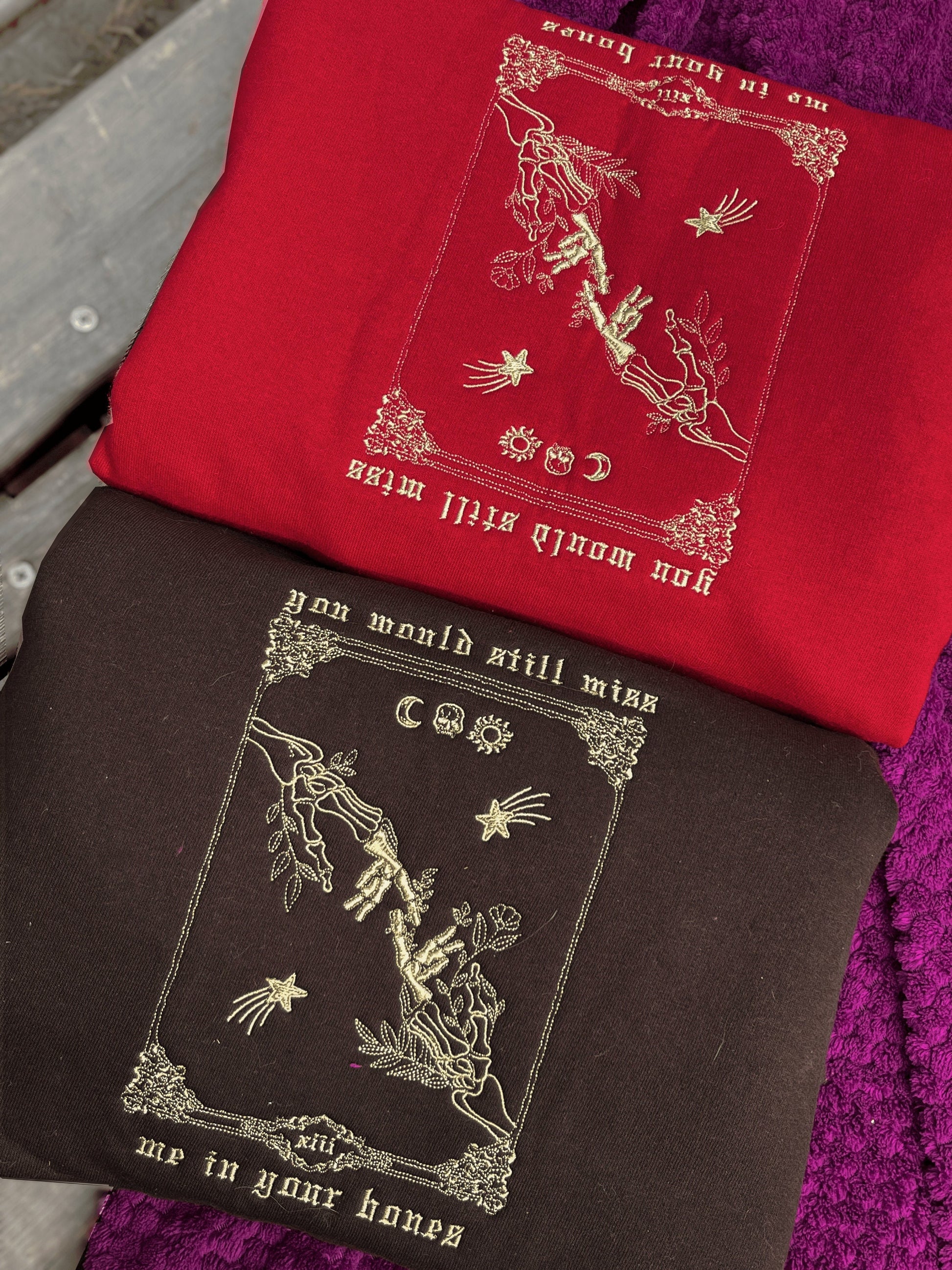 Merch that lasts for the love that lasts. This design is inspired by Taylor Swift's 'my tears ricochet' off Swift's 8th studio album, 'folklore' . The subtle design features the lyric 'you would still miss me in your bones' and an illustration inspired by the death tarot card, which is the 13th card in the deck.