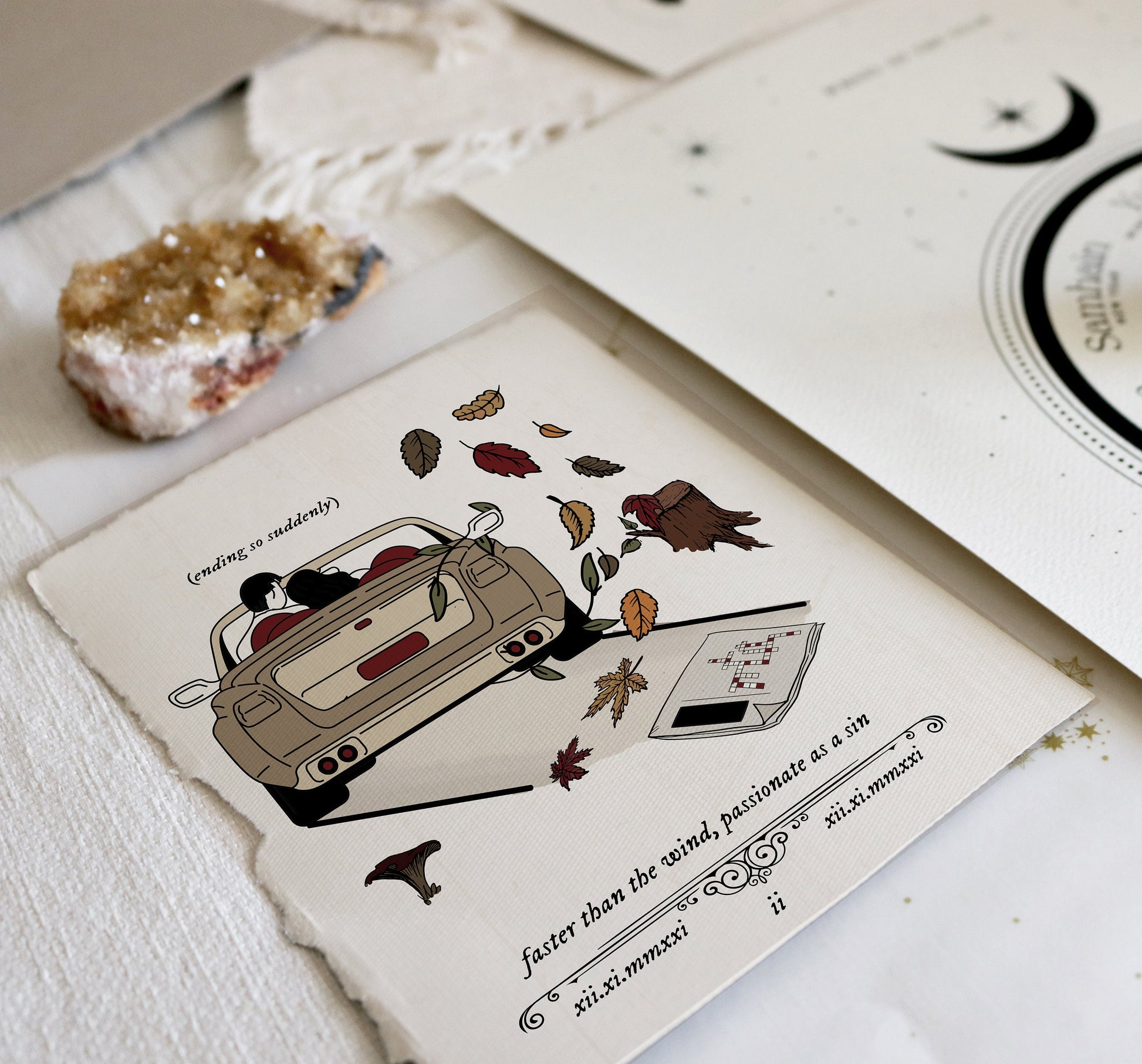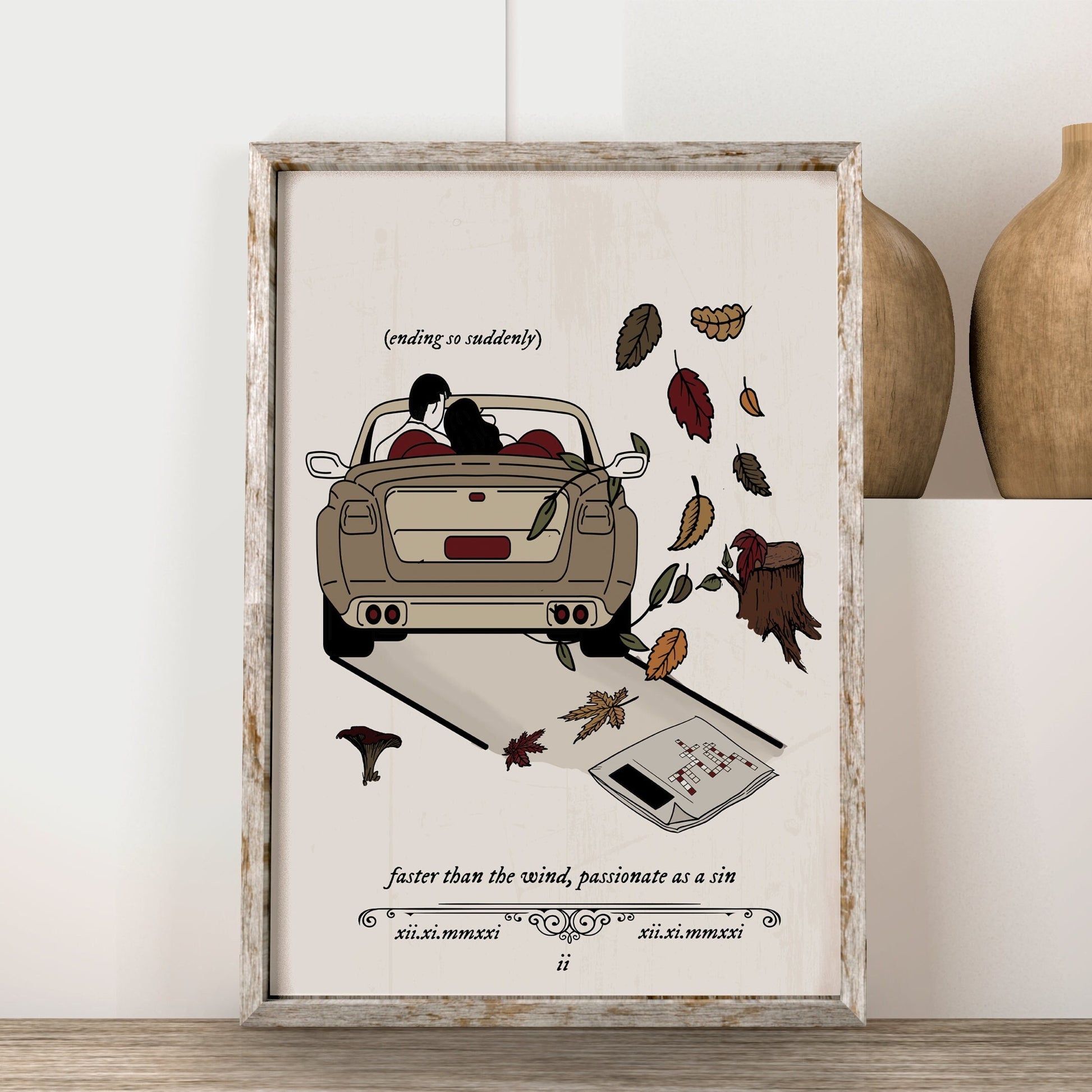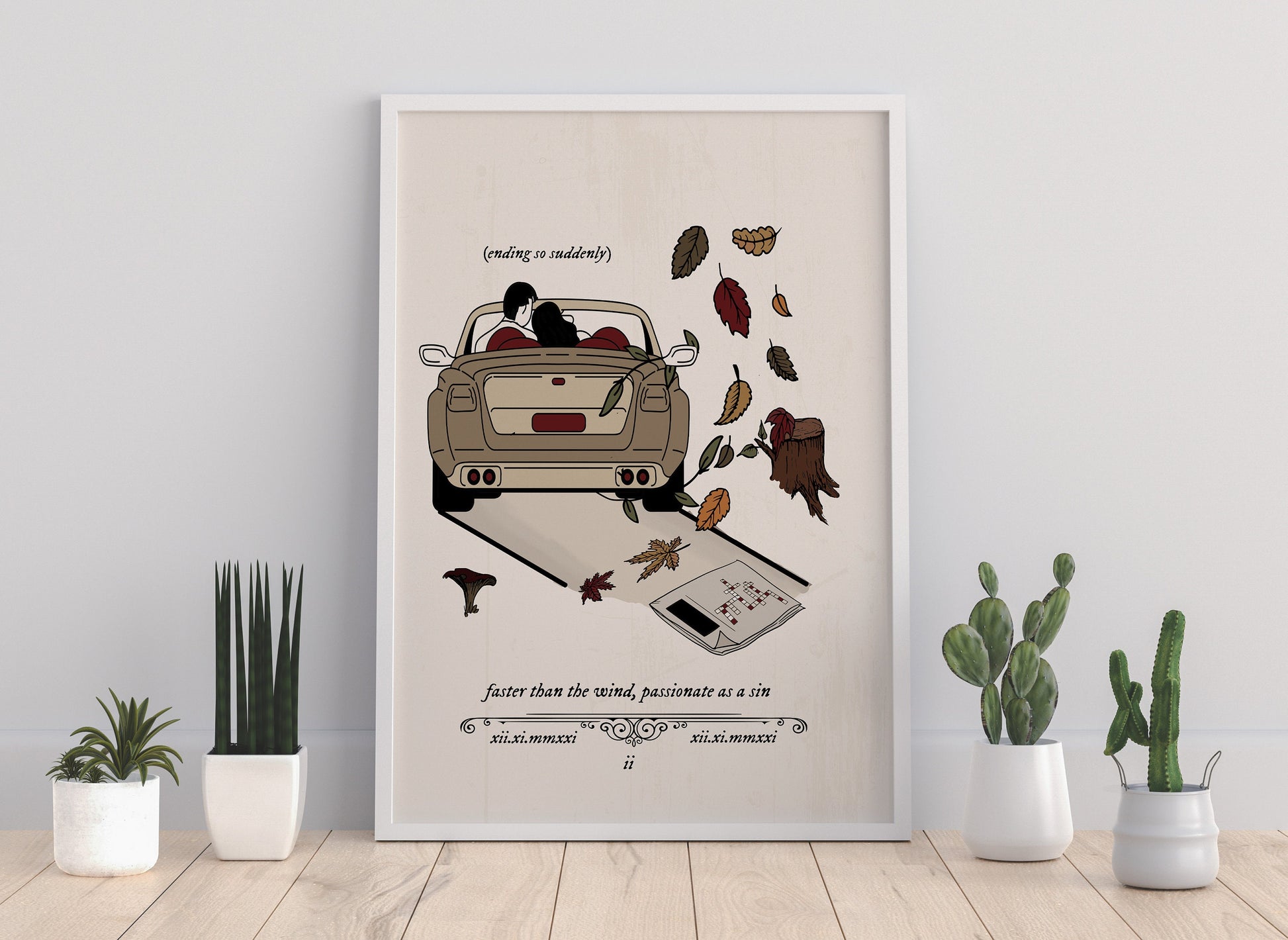 This print is inspired by Taylor Swift's 'Red', the title track off the album 'Red', featuring a set of lyrics ('faster than the wind, passionate as a sin, ending so suddenly'), with an illustration to match, making it the perfect autumn decor for a Swiftie in your life.