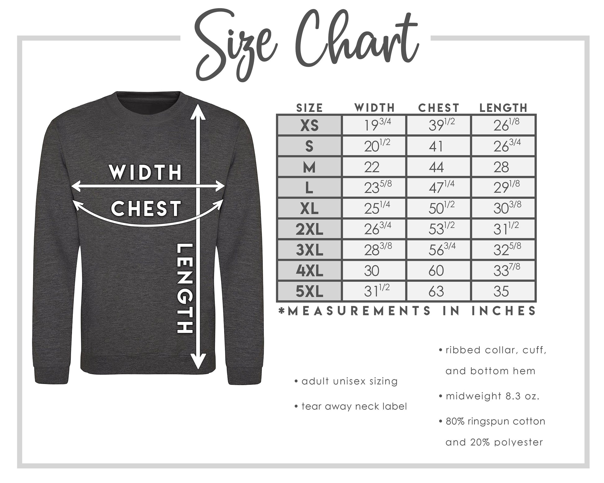 1x1 rib cuffs, waistband, and collar. Size up for an oversized fit.
