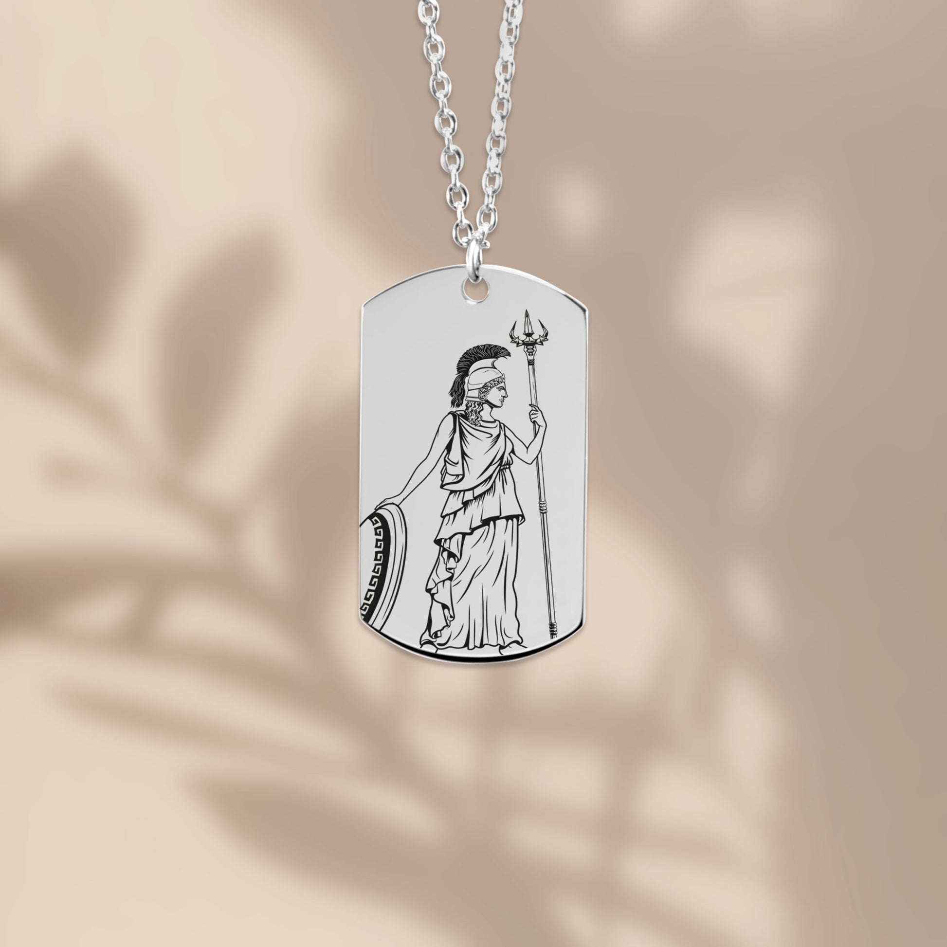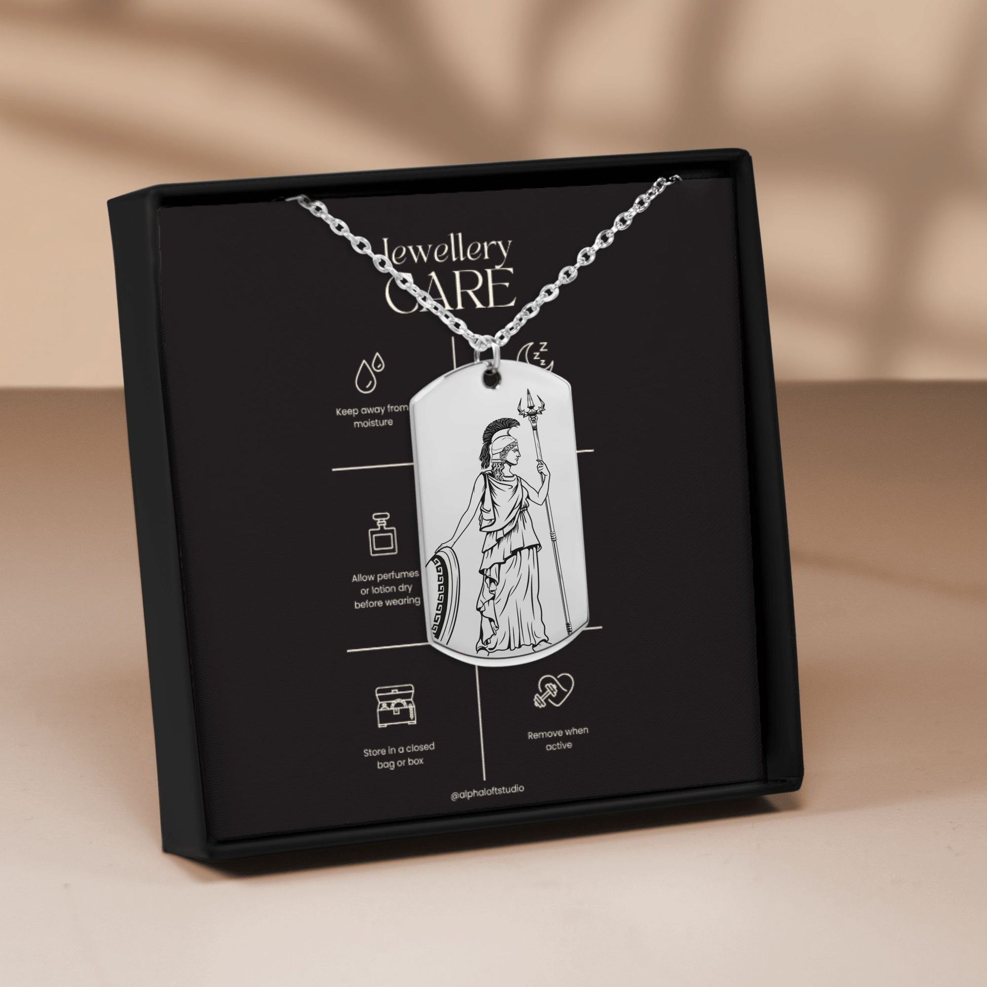 This stainless steel pendant features a portrait of Athena in her full glory: helmeted, shielded, and spear in hand — the embodiment of strategic power. On the back is a tribute to one of her oldest symbols, the Athenian owl, adapted from the ancient tetradrachm coins of classical Athens. It’s a nod to her wisdom and her lasting influence, rooted in both mythology and material history.