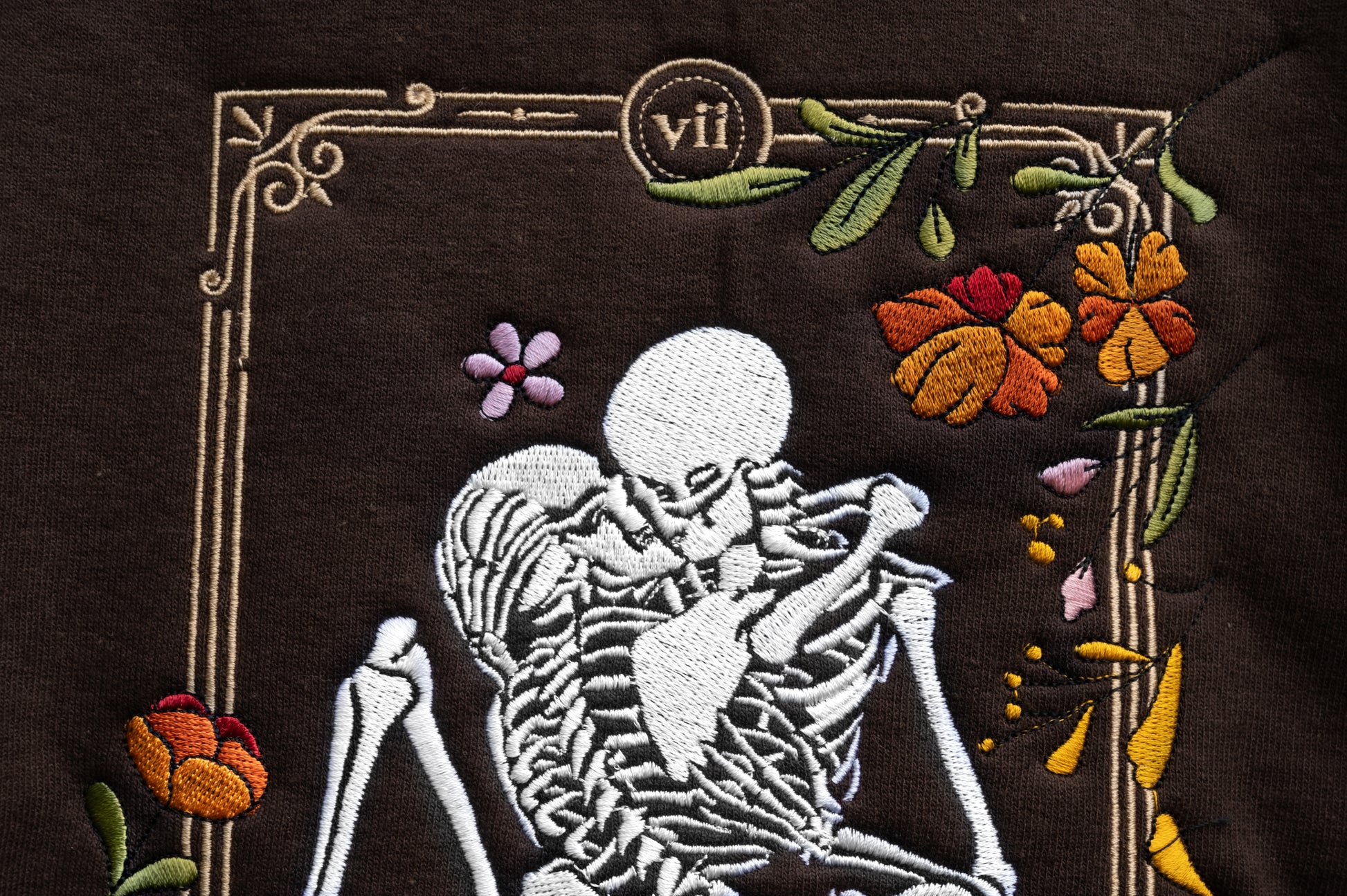 A zip-up version of the best-selling "Everywhere, Everything" tarot-inspired design, with the lyric embroidered on the front & the design on the back.