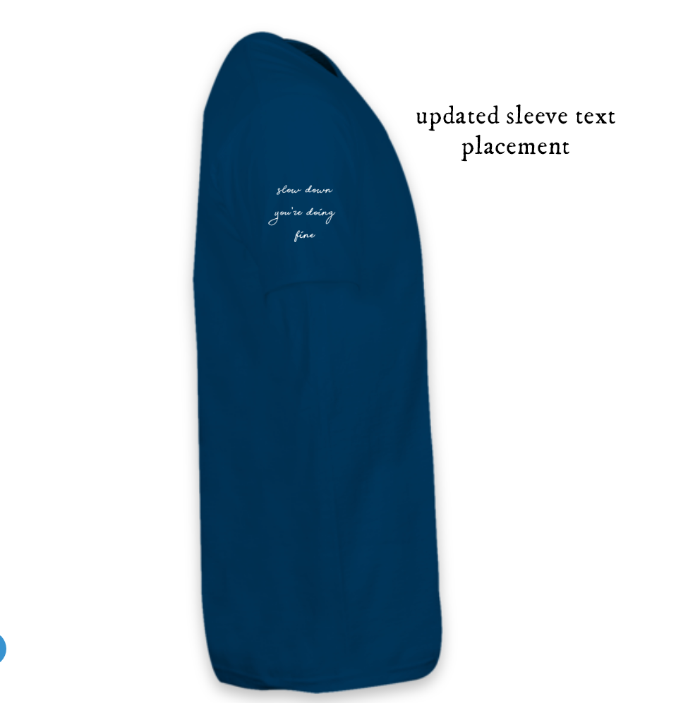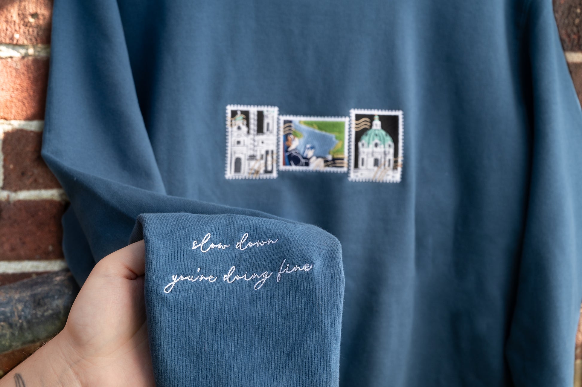 Inspired by the song Vienna by Billy Joel, this design is for the days when you're overwhelmed by the pressure to have it all figured out. The embroidery on the sleeve – “slow down, you’re doing fine” - is a soft mantra for anyone who’s been running on empty, needing permission to pause.