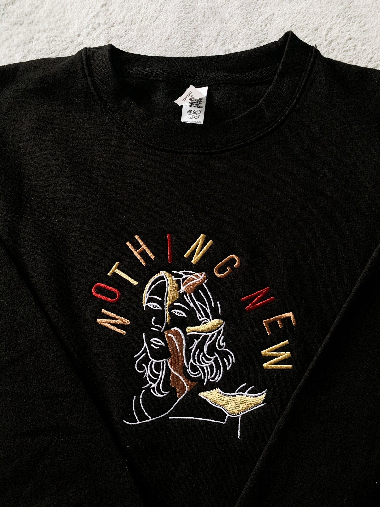 Each crewneck is 80% cotton and 20% polyester, long-sleeved and comes in the shade of black. Unisex fit, each sweatshirt is true to size. The design is then embroidered on the crewneck using an embroidery machine and shipped from London, UK. The backing of the embroidery makes it more durable and ensures a smooth wearing experience. Please note that colours might be slightly different due to screen calibrations.